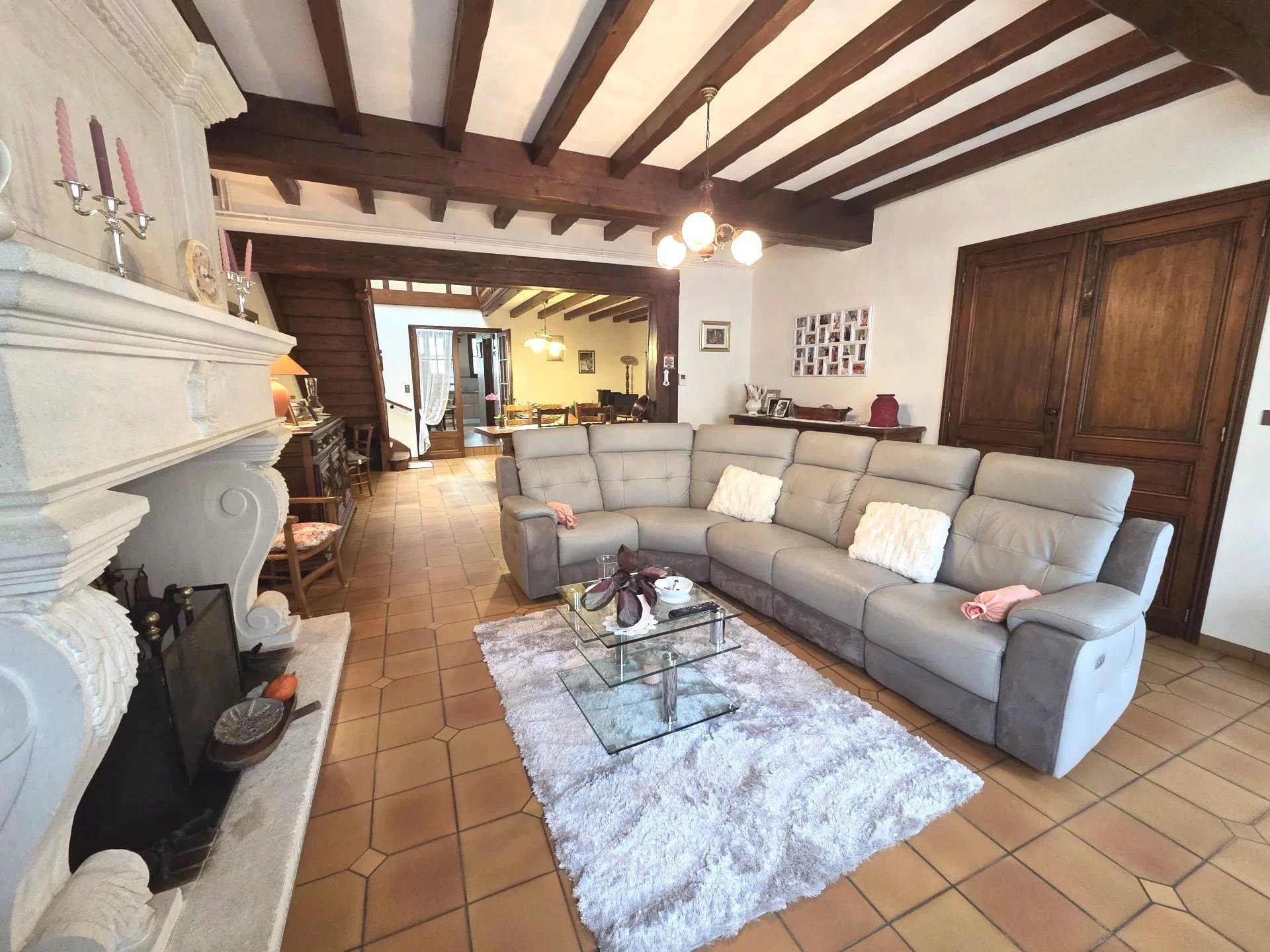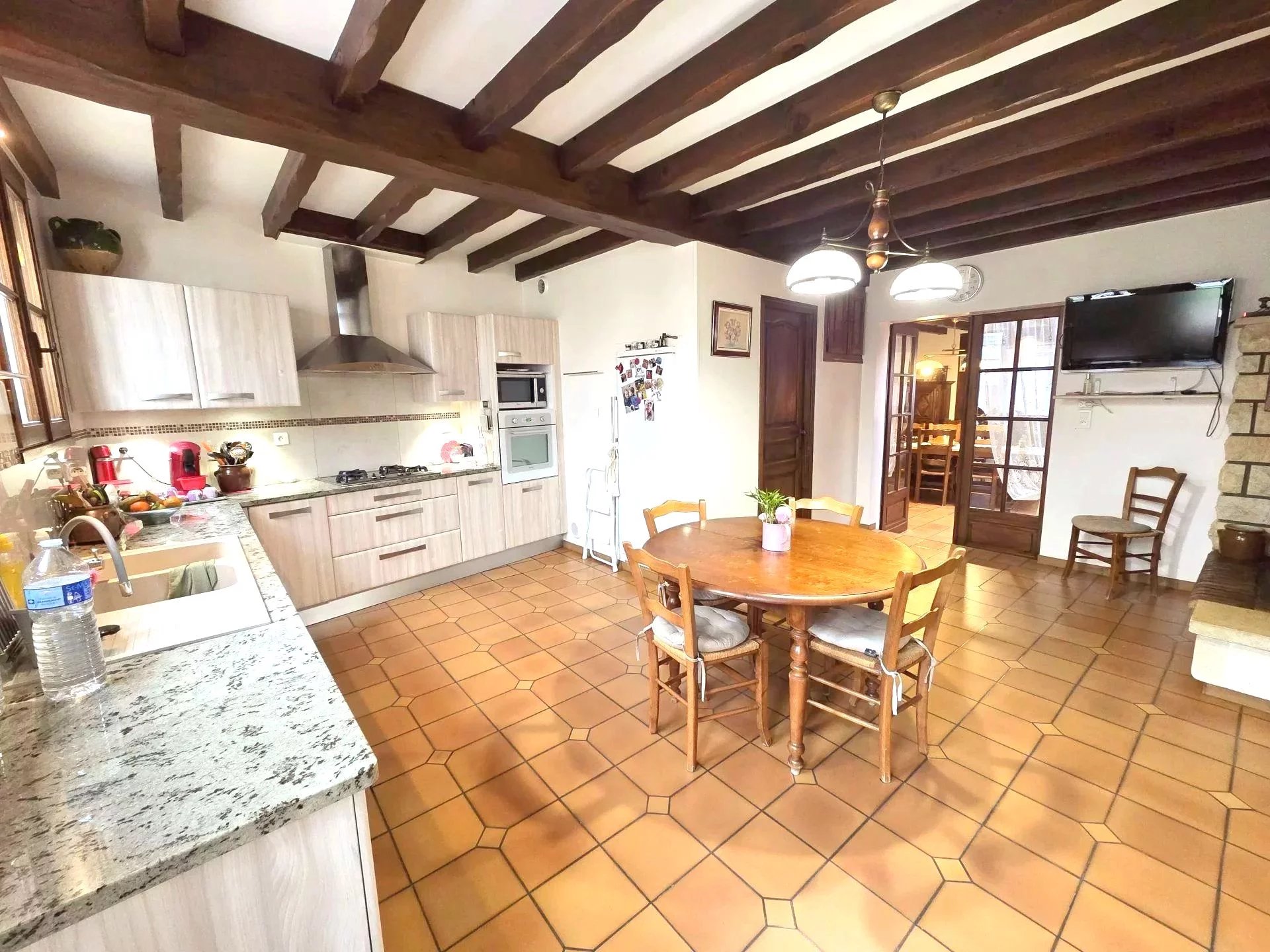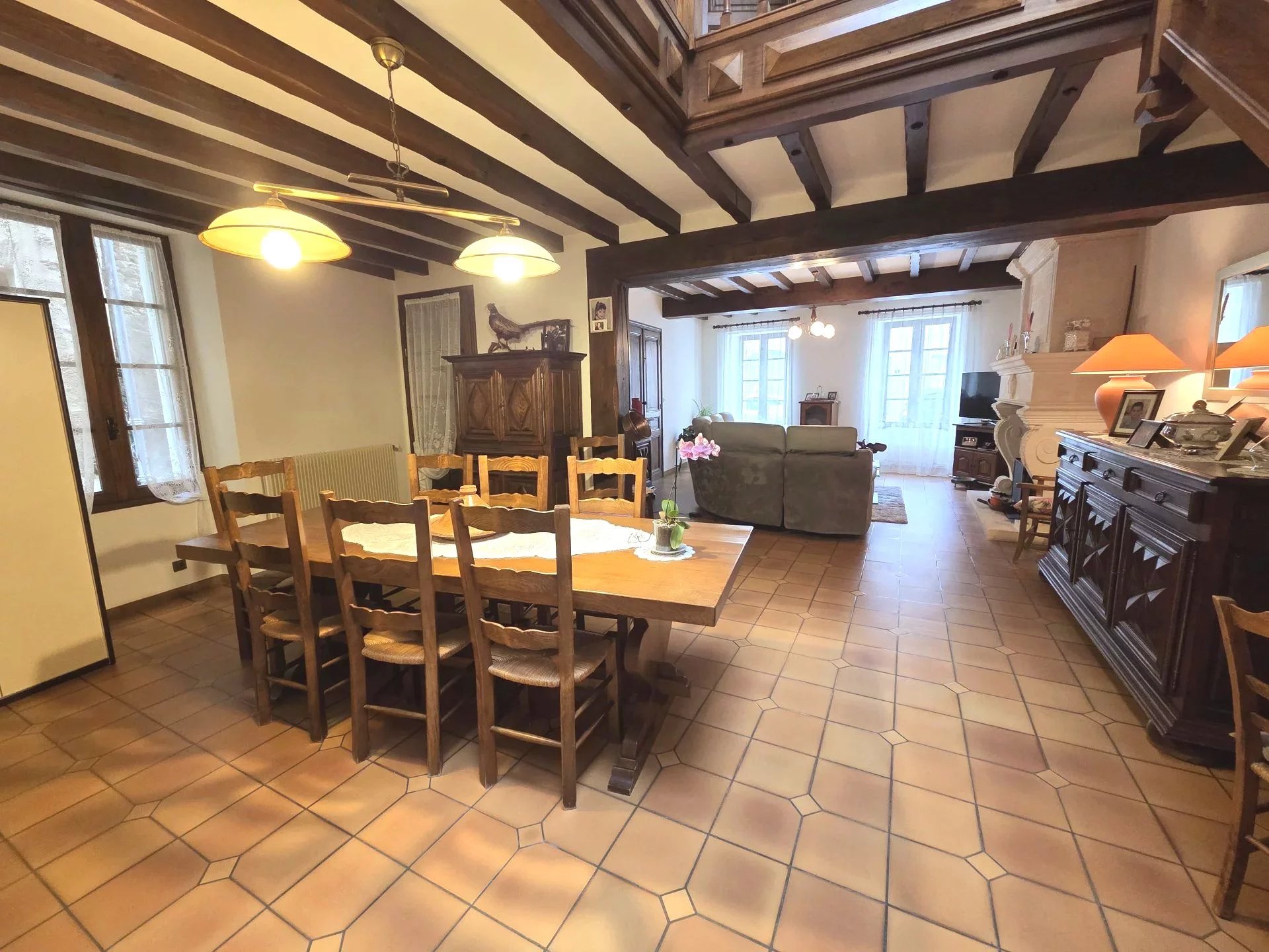 Espaces de vie conviviaux : Un vaste salon-séjour et une cuisine spacieuse, tous deux agrémentés d'une cheminée pour une ambiance chaleureuse en hiver.